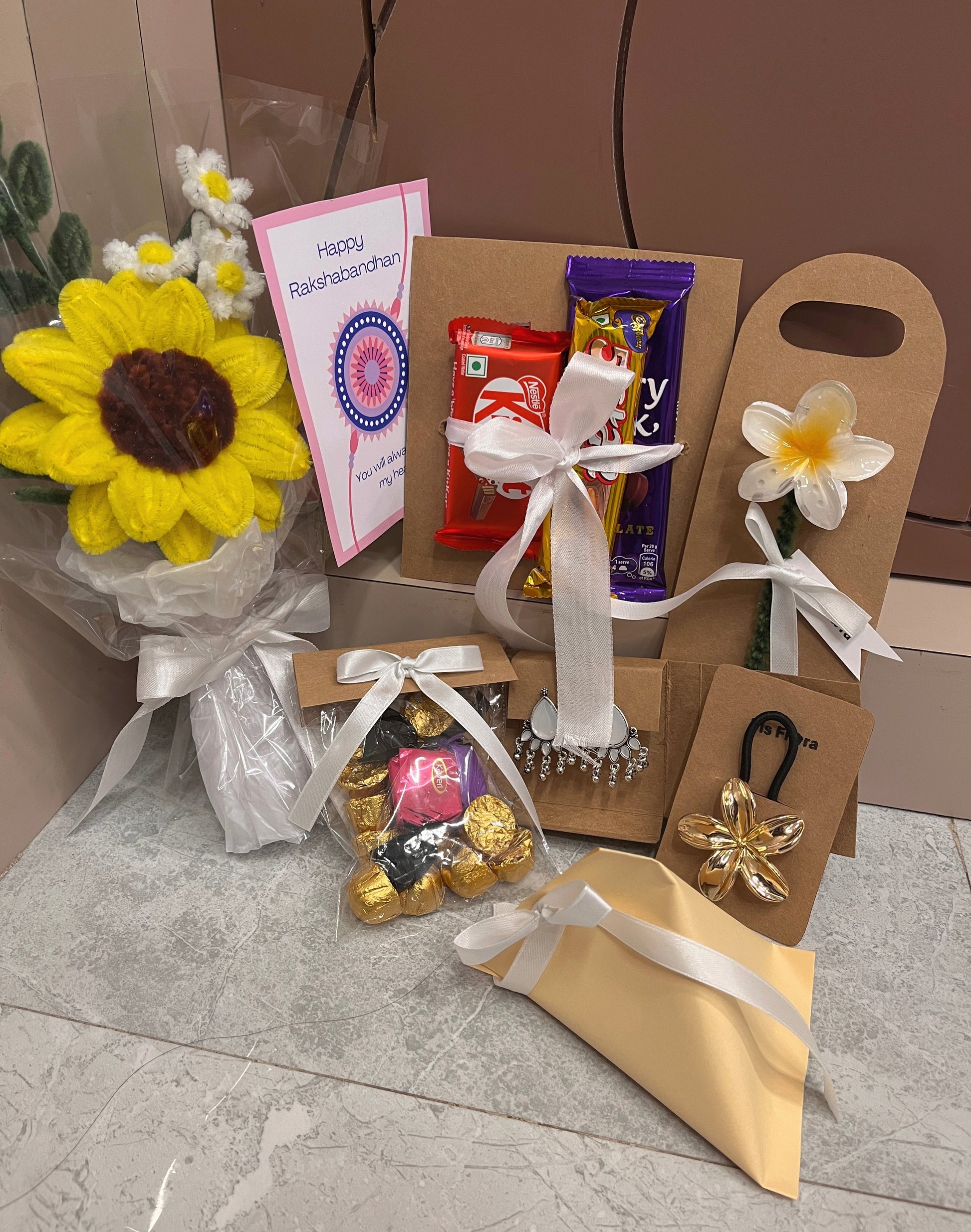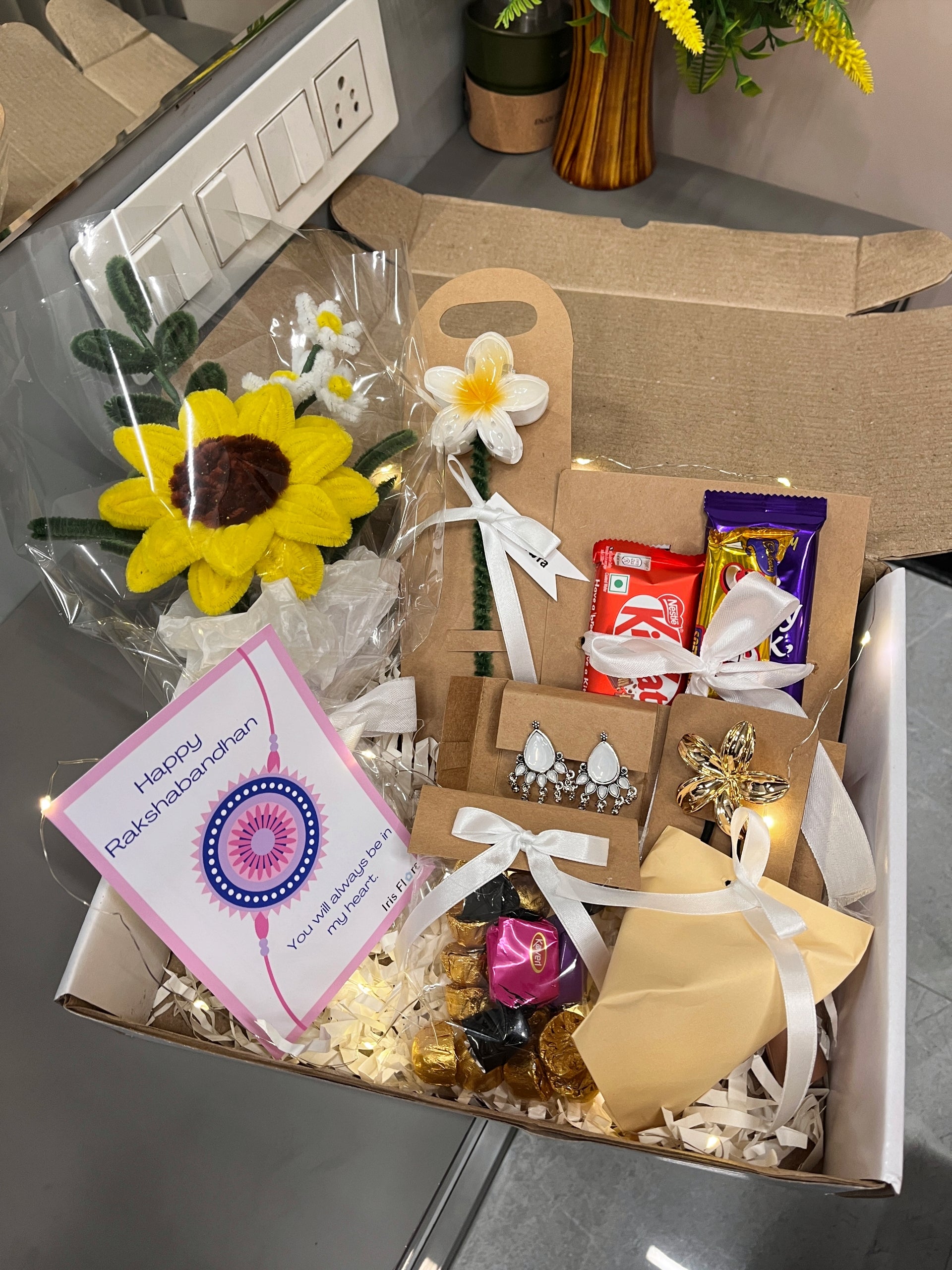 Surprise your sister with this thoughtfully curated hamper filled with joy! It includes a beautiful bouquet, delicious chocolates, a cute keychain, stylish hair tie, elegant earrings, warm fairy lights, and a trendy hair claw clip – all packed with love to make her smile brighter this Raksha Bandhan.